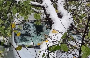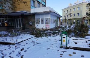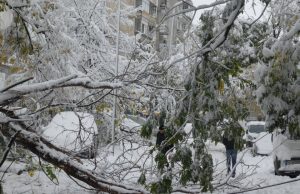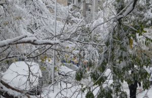 Платното и тротоарите са осеяни с паднали огромни клони. От мокрия и тежък...