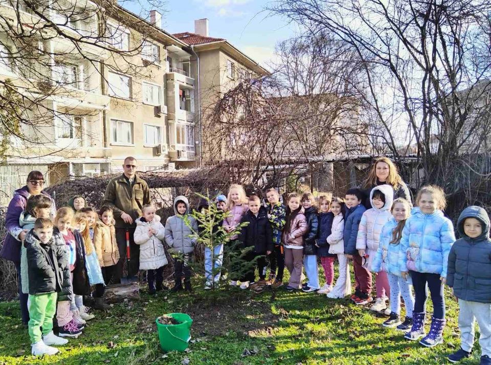 Децата от групите „Чучулига“ и „Звездичка“ на ДГ „Слънце“ залесиха днес контейнерните коледни дръвчета, които получиха като подарък от екипа на ДГС-Шумен. Директорката на градината Христина Стоянова, инж. Иван Стефанов от горското стопанство и преподавателите помогнаха на малчуганите да засадят фиданките и да ги полеят. Малките ученици, които през миналата година участваха в занятия по горска педагогика, преговориха кои са най-важните моменти от самото залесяване – изправяне на коренчетата, утъпкване на почвата и редовно поливане на дръвчетата през топлите дни.