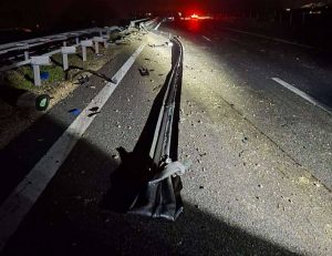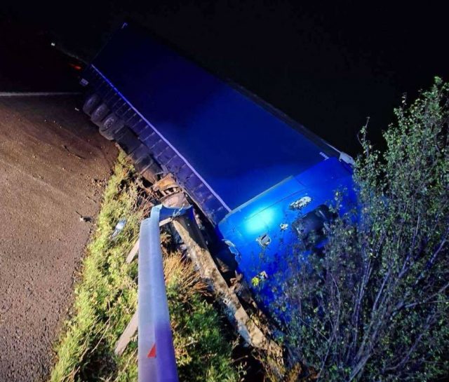 Водач на тежкотоварен автомобил се е ударил в крайпътни мантинели на 364 км, навлязъл е в другото платно за движение и е напуснал пътното платно.