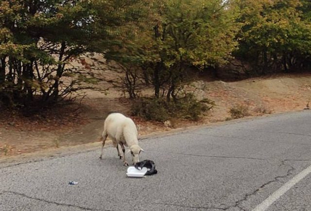 За овцата е обяснимо. Тя проверява дали нещо не е останало от купеното от обект за бързо хранене.