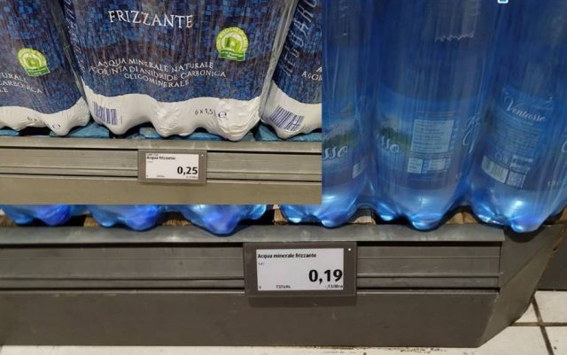 Хипермаркет в Италия. Минералната вода струва от 19 до 25 евроцентра за литър и половина.