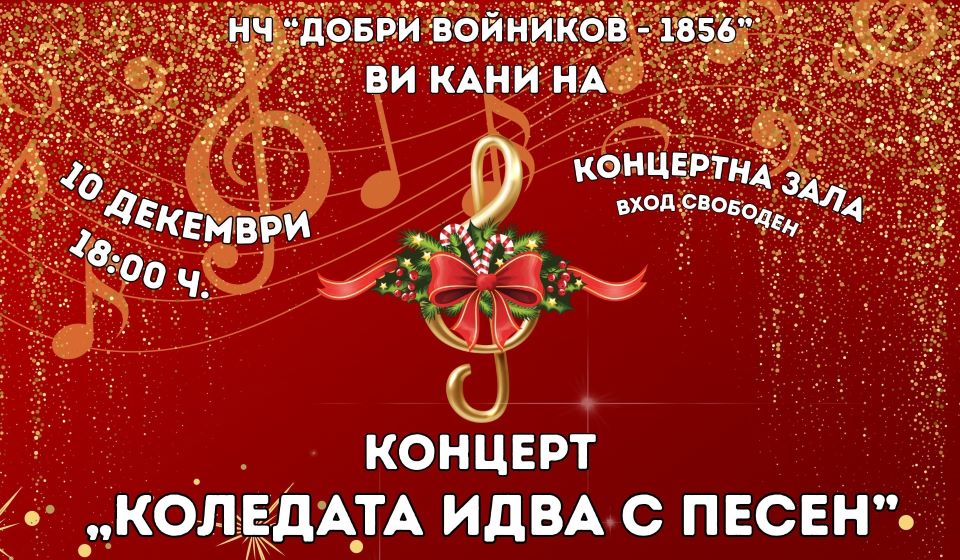 В навечерието на Рождество Христово Народно читалище „Добри Войников – 1856“ организира празничен концерт под мотото „Коледата идва с песен“. На 10 декември (сряда) от 18.00 часа на сцената в концертната зала на читалището ще излязат Смесен хор „Родни звуци“ с диригент проф. д-р Николай Андриянов и корепетитор Ваня Джамбазова и Вокална група „Малка серенада“ с ръководител Димитър Петков. В концертната програма с изпълнения на флейта и пиано ще участва и Ерато Николова от класа по пиано и флейта с преподаватели Ваня Джамбазова и Виктория Стефанова.