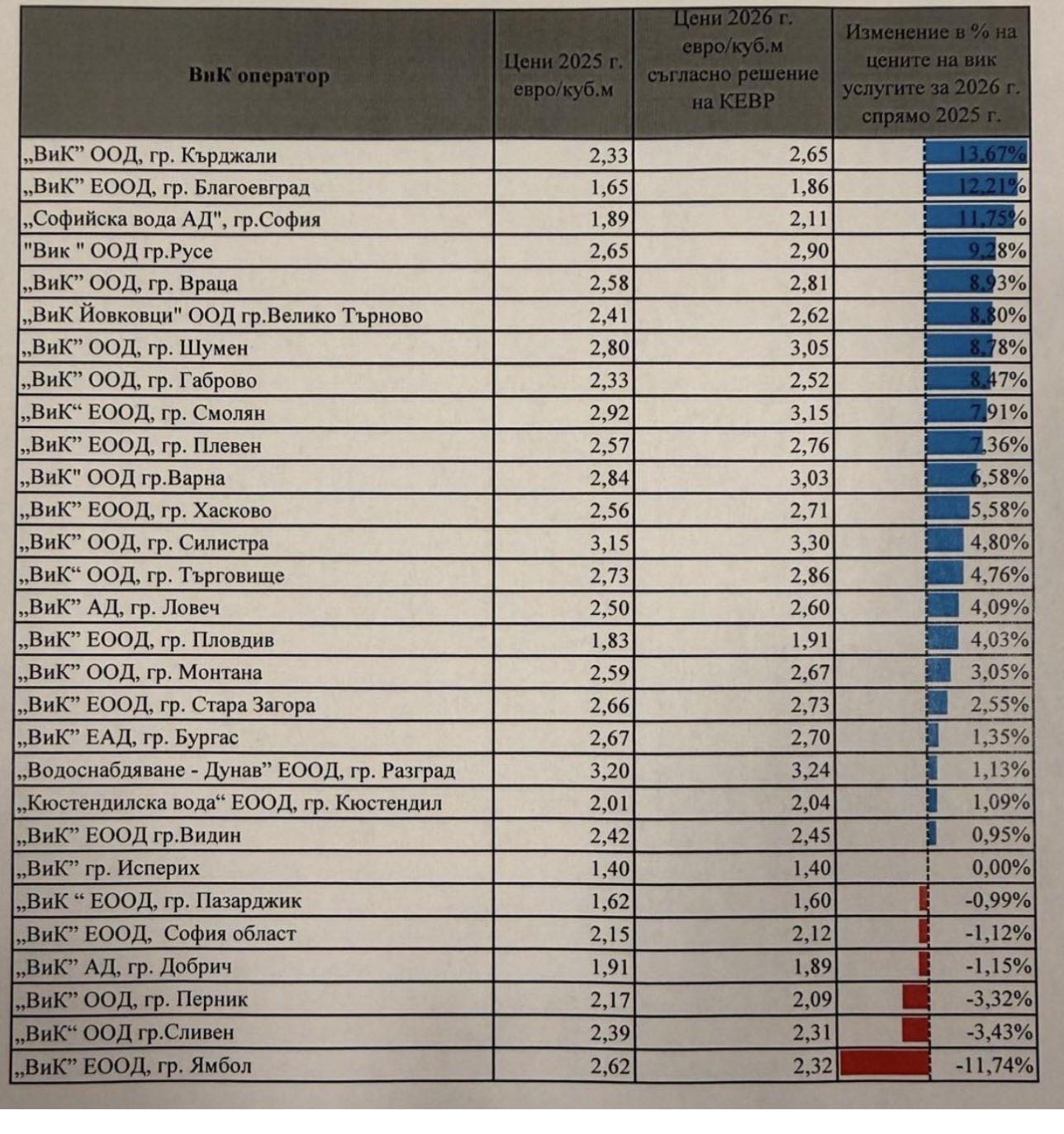 Нанков добави още, че във ВиК – Кърджали над 13,6 % е увеличението на цената на водата от 1 март, във ВиК- Благоевград е над 12%, във ВиК – Русе е над 9%, а във ВиК- Велико Търново е над 8,8%.