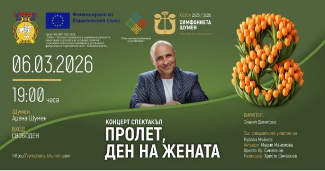По повод предстоящия празник на жената – 8 март и настъпващата пролет, Община Шумен и Симфониета Шумен кани жители и гости на града на концерт спектакъл „Пролет, ден на жената“. Концертът е на 06 март от 19.00 ч. в зала „Арена-Шумен“.