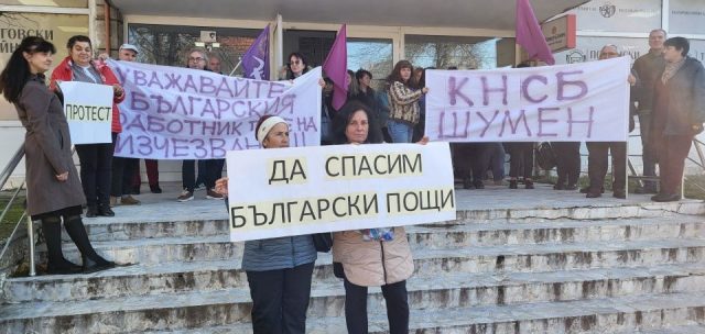 Служители на „Български пощи“ протестираха днес в Шумен пред клона до автогарата. Недоволните бяха организирани от КАНСБ. Протестът бе част от националния протест в столицата.