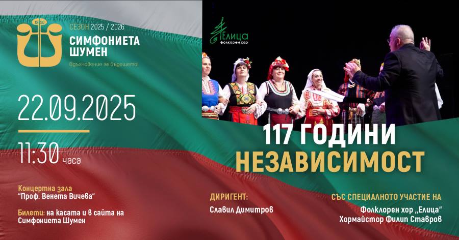 На 22 септември 2025 г. от 11.30 ч. в Концертна зала „Проф. Венета Вичева“ Симфониета Шумен ще поднесе на своите почитатели специален концерт, ознаменуващ един от най-светлите дни в българската история – Деня на независимостта. Под диригентството на маестро Славил Димитров ще прозвучат вдъхновяващи произведения, носещи духа на свободата и националната гордост.