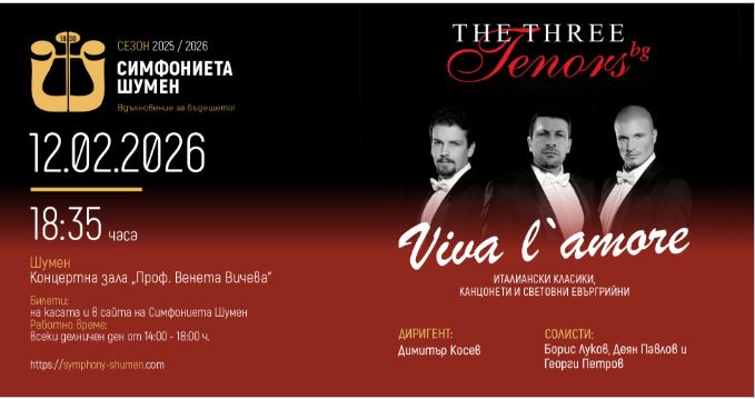 На 12 февруари – четвъртък от 18.35 часа в Концертна зала „Проф. Венета Вичева“ Симфониета Шумен кани публиката на специална вечер, посветена на любовта, страстта и италианската музикална традиция. Това съобщиха от културния институт в града.