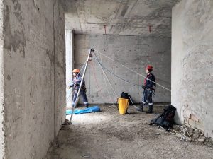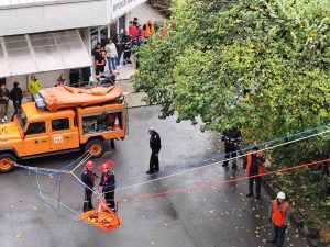 Екип прониква в сграда и започва разузнаване. С помощта на въжено алпийска линия тип „тролей“ и твърда носилка мъжът е евакуиран и транспортиран до екипите на спешна помощ.